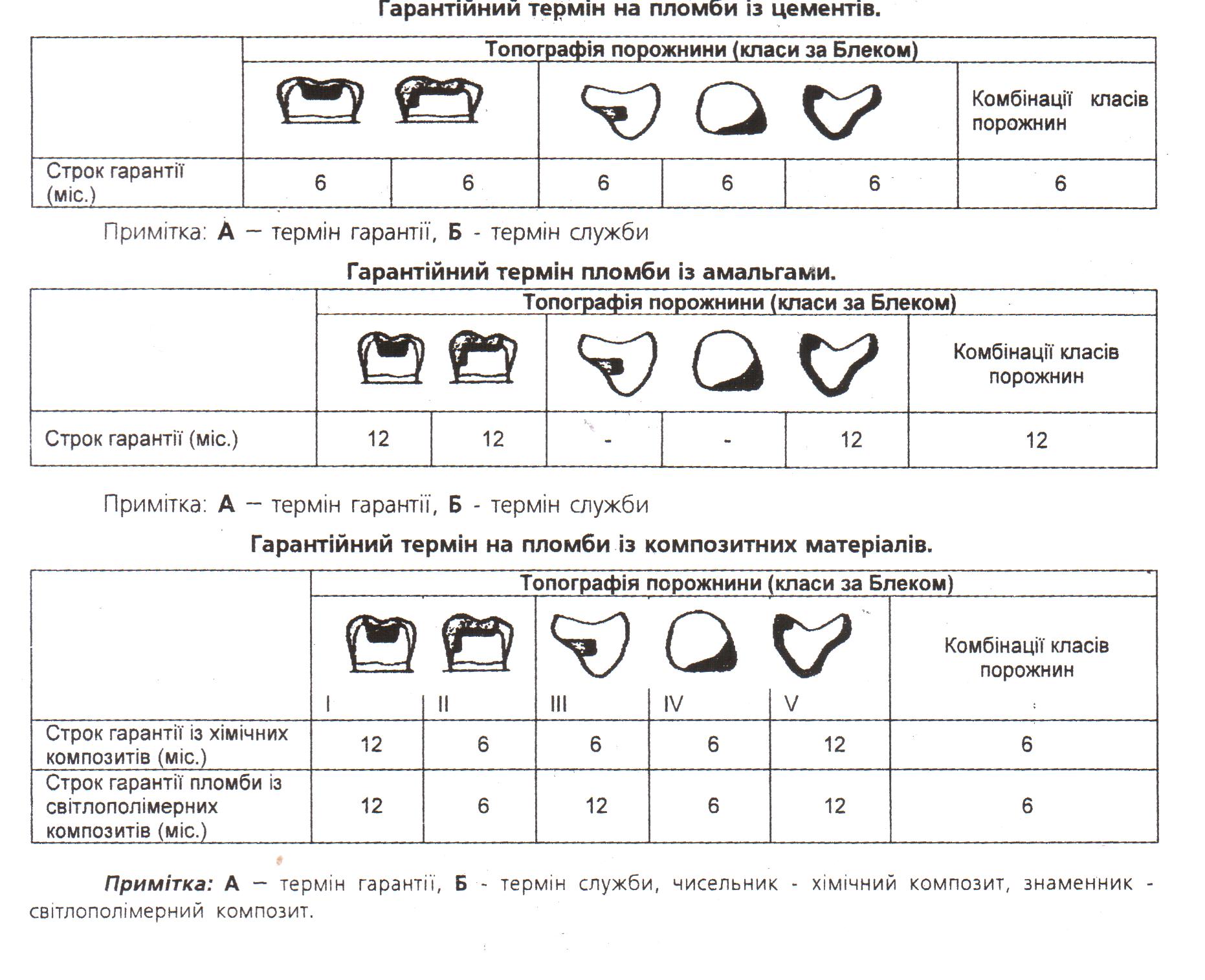 Гарантії анатомо-функціонального зберігання пломби при лікуванні карієсу, пульпіту та періодонтиту постійного зуба визначаються з урахуванням топографії порожнини та виду пломбувальних матеріалів, які застосовані.
